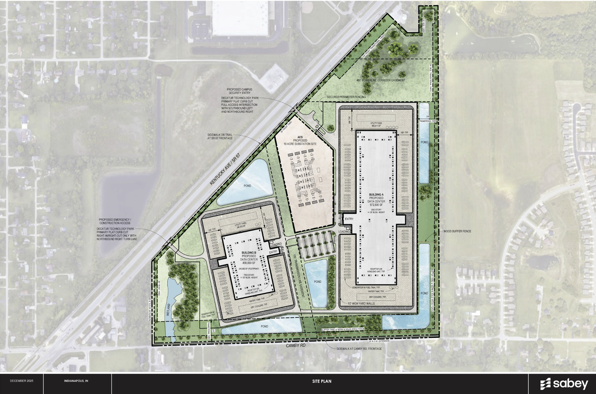 Building A (closest to residential homes): One-story data center of approximately 572,500 SF footprint with a height of 30 feet. Building B (closest to Kentucky Avenue): Two-story data center of approximately 490,000 SF footprint with a height of 50 feet. A 10-acre electrical substation site, campus security entry on SR-67, and designated emergency/construction access points.